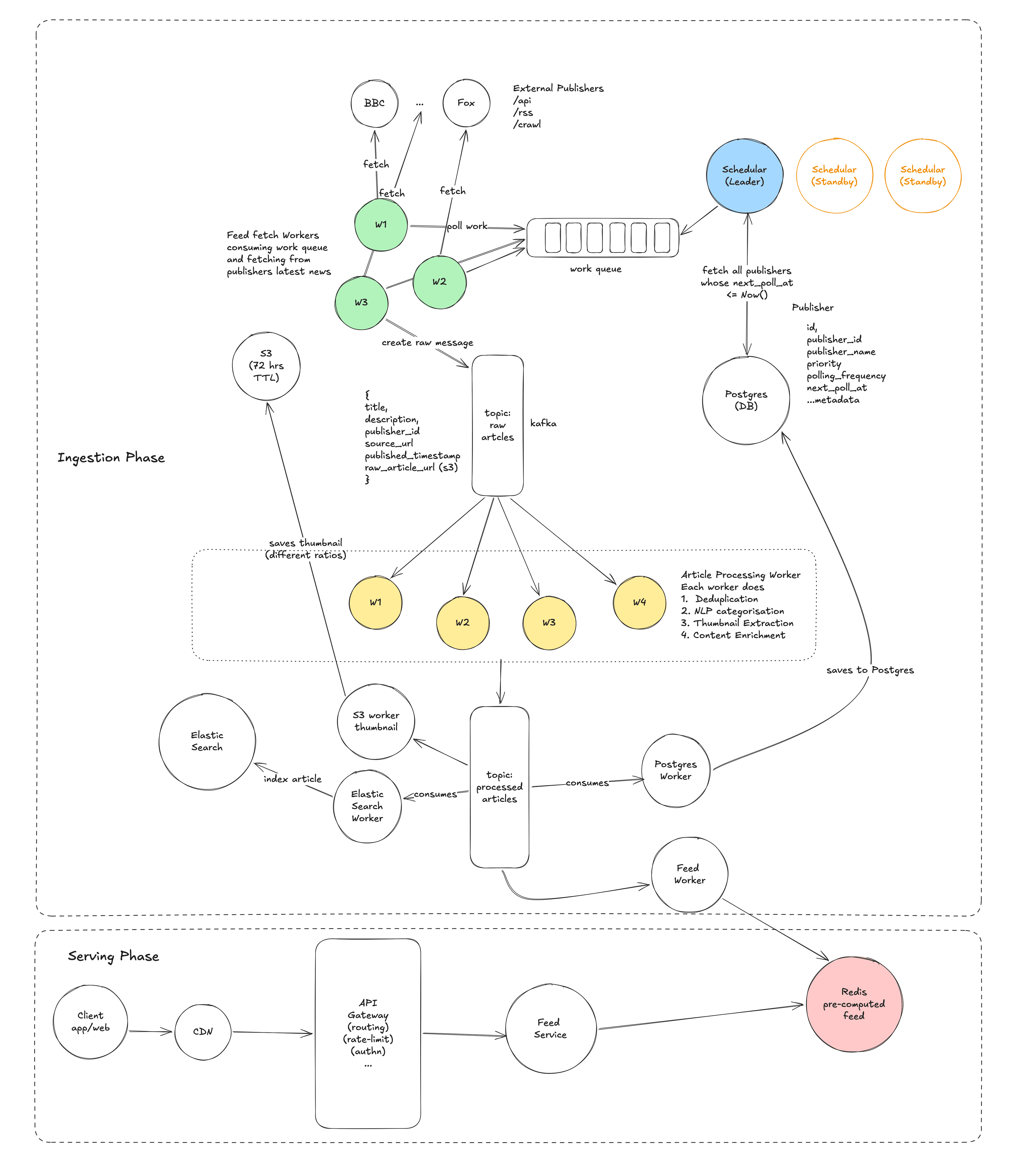 Users come to a news aggregator specifically because they want current news. If an article was published 2 hours ago and still doesn't appear in the feed, the system has failed its core value proposition. We aim for major publishers' articles to appear within 5 minutes and smaller publishers within 30 minutes. This drives decisions about our polling frequency, processing pipeline latency, and cache invalidation strategy.