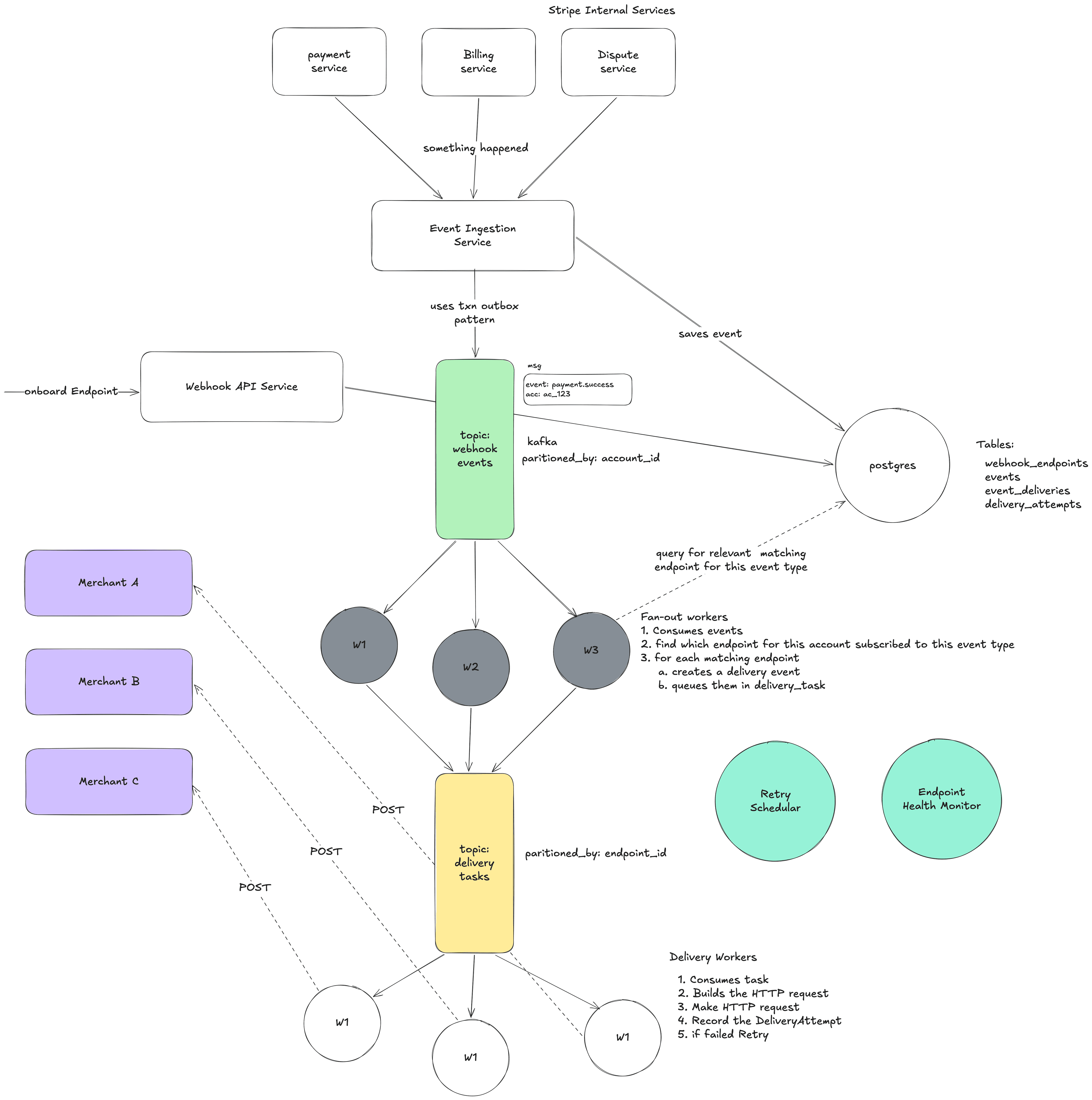 Caching endpoint subscriptions: Looking up endpoints for every single event would hammer the database. Instead, we cache the endpoint configuration in memory (or Redis), with cache invalidation when endpoints are created/updated/deleted. This lookup happens millions of times per day; it needs to be fast.